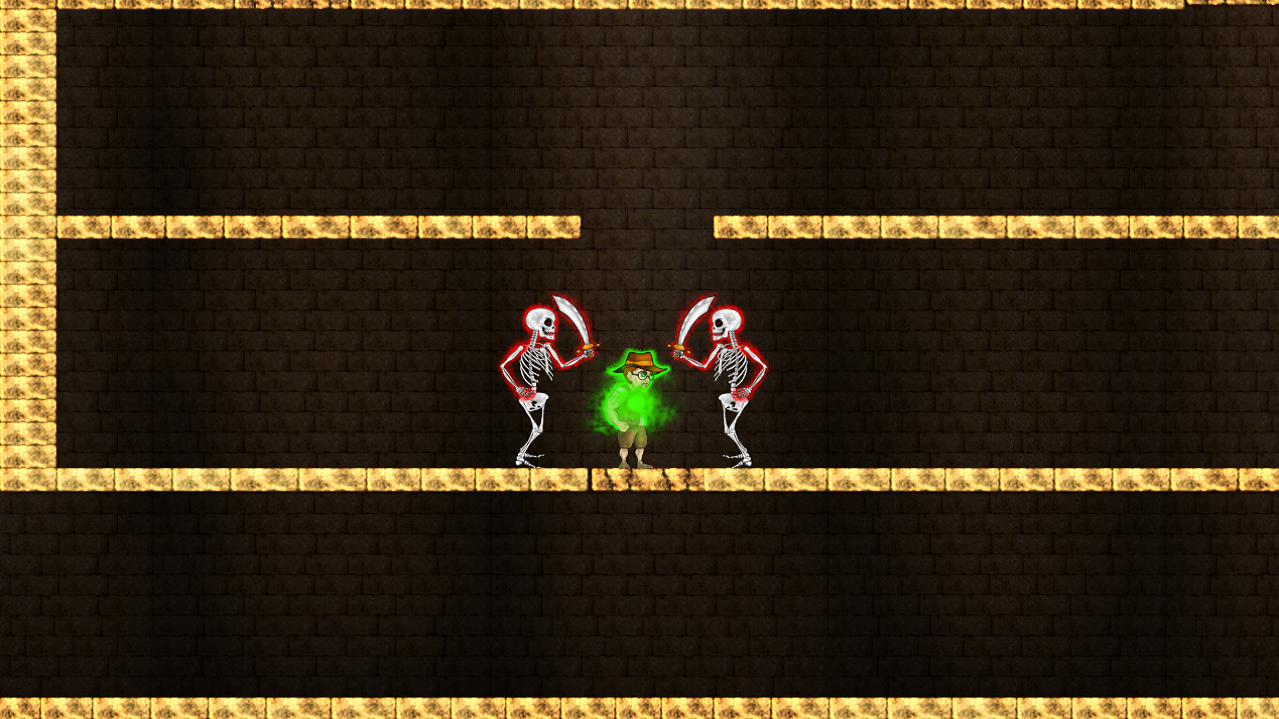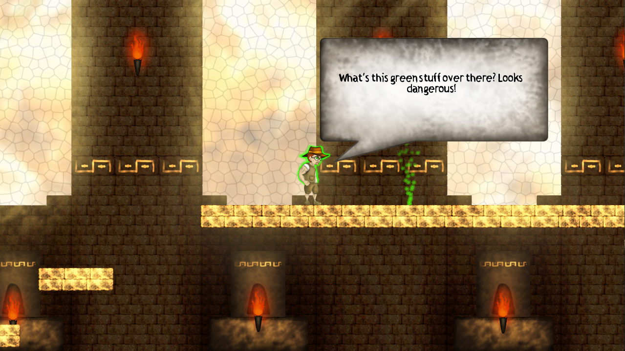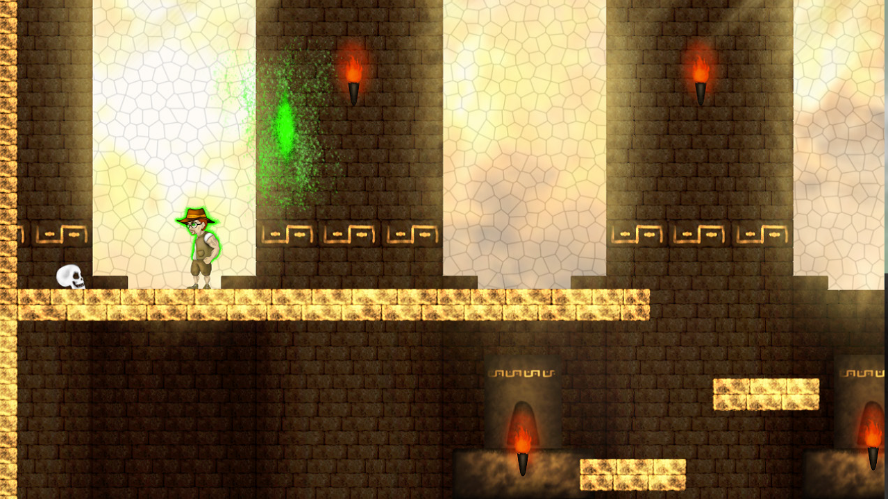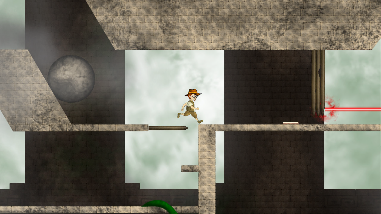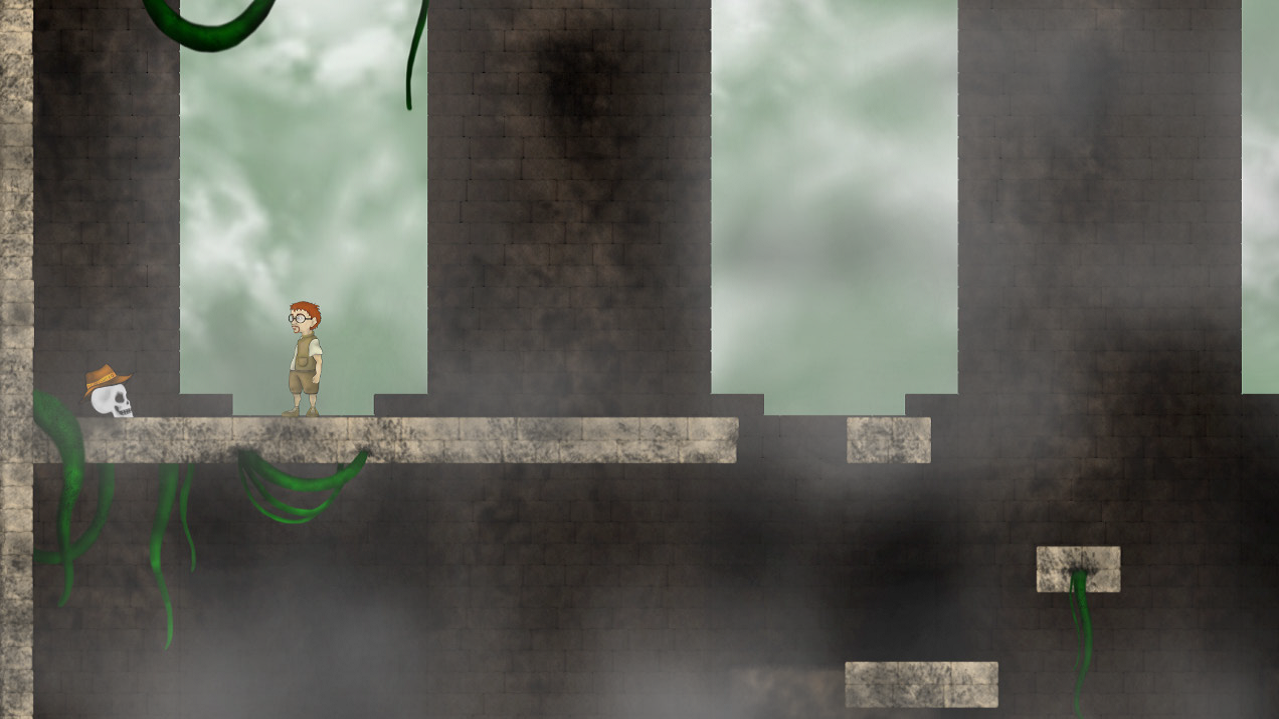 IndieJohn is a 2D Jump 'n' Run game. The player takes the role of archaeologist and adventurer John, who explores a still unexplored ruin. After entering it he sees a skull with a hat, which he also takes. Immediately afterwards he hears a voice from his hat, which tells him of his suffering. The soul tells him that he is caught here and asks him for help. The spirit in the hat allows him to travel through portals to the past in order to overcome already destroyed passages, and thus penetrate the interior of the temple. At the same time, he transfers a part of his soul into the hero's body and gives him special abilites to defend himself from the creatures of the past. He also promises him a long forgotten treasure.